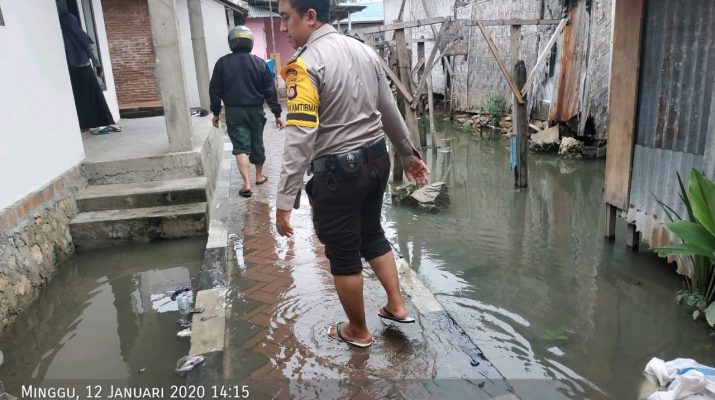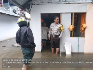 Bhabinkamtibmas kel.ipilo polsek kota timur Bripka Romi Paera melakukan monitoring aliran sungai sampai di pemukiman warga yang rumahnya tergenang air setinggi betis orang dewasa.