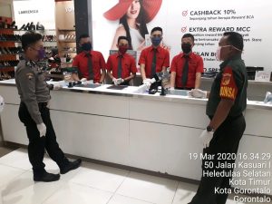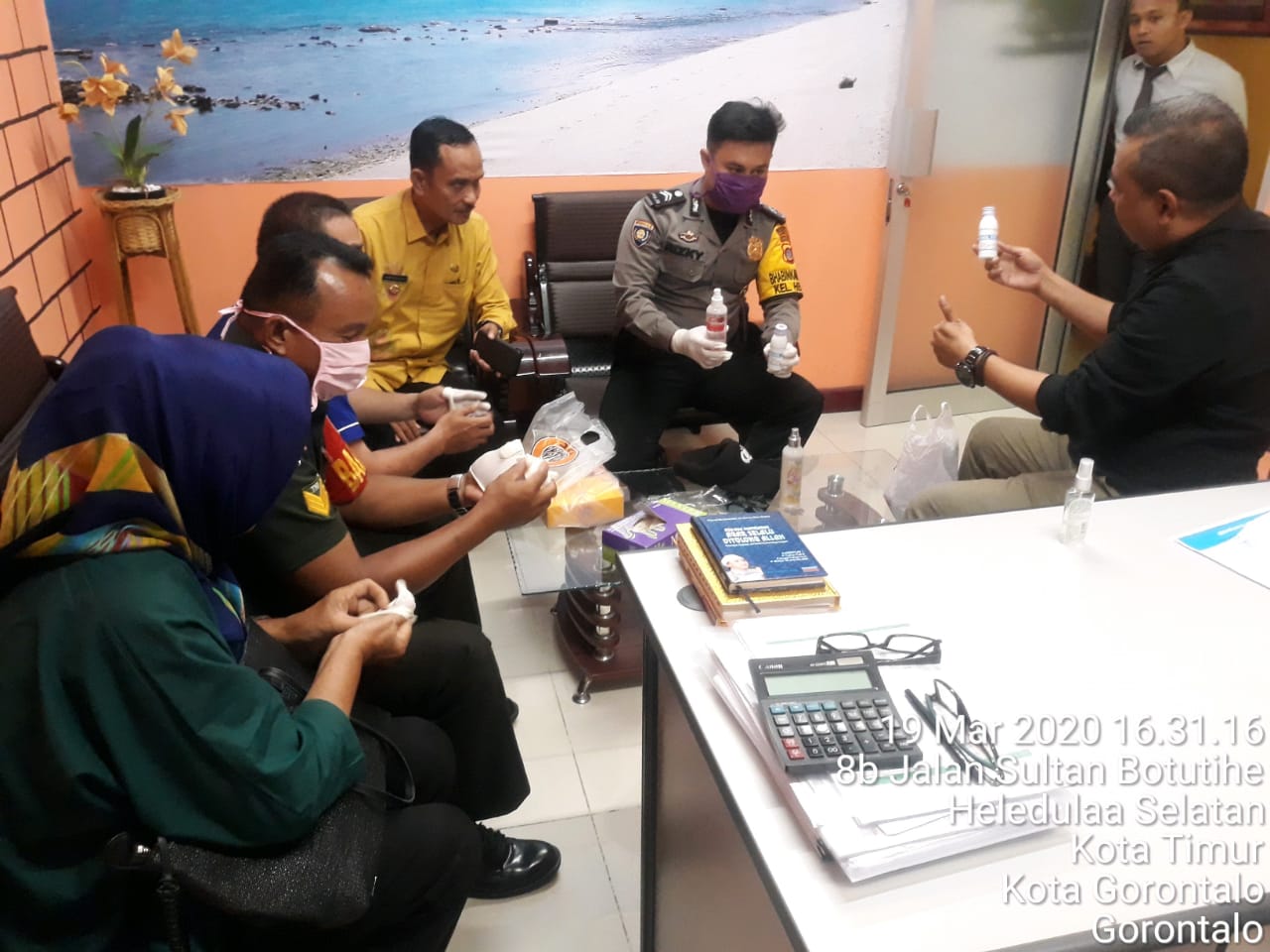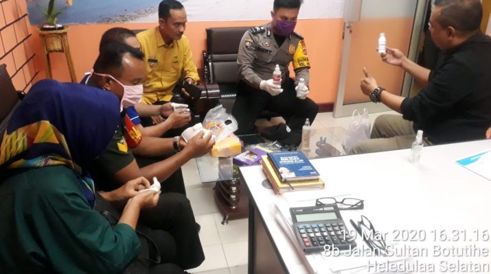 Polres Gorontalo Kota – Bhabinkamtibmas kel.Heledulaa Selatan Polsek Kota Timur Polres Gorontalo Kota Briptu Rizky Djau bersama babinsa dan Lurah Heledulaa Selatan ( Tiga Pilar ) membagikan masker pada masyarakat , Kamis ( 19/03/20)