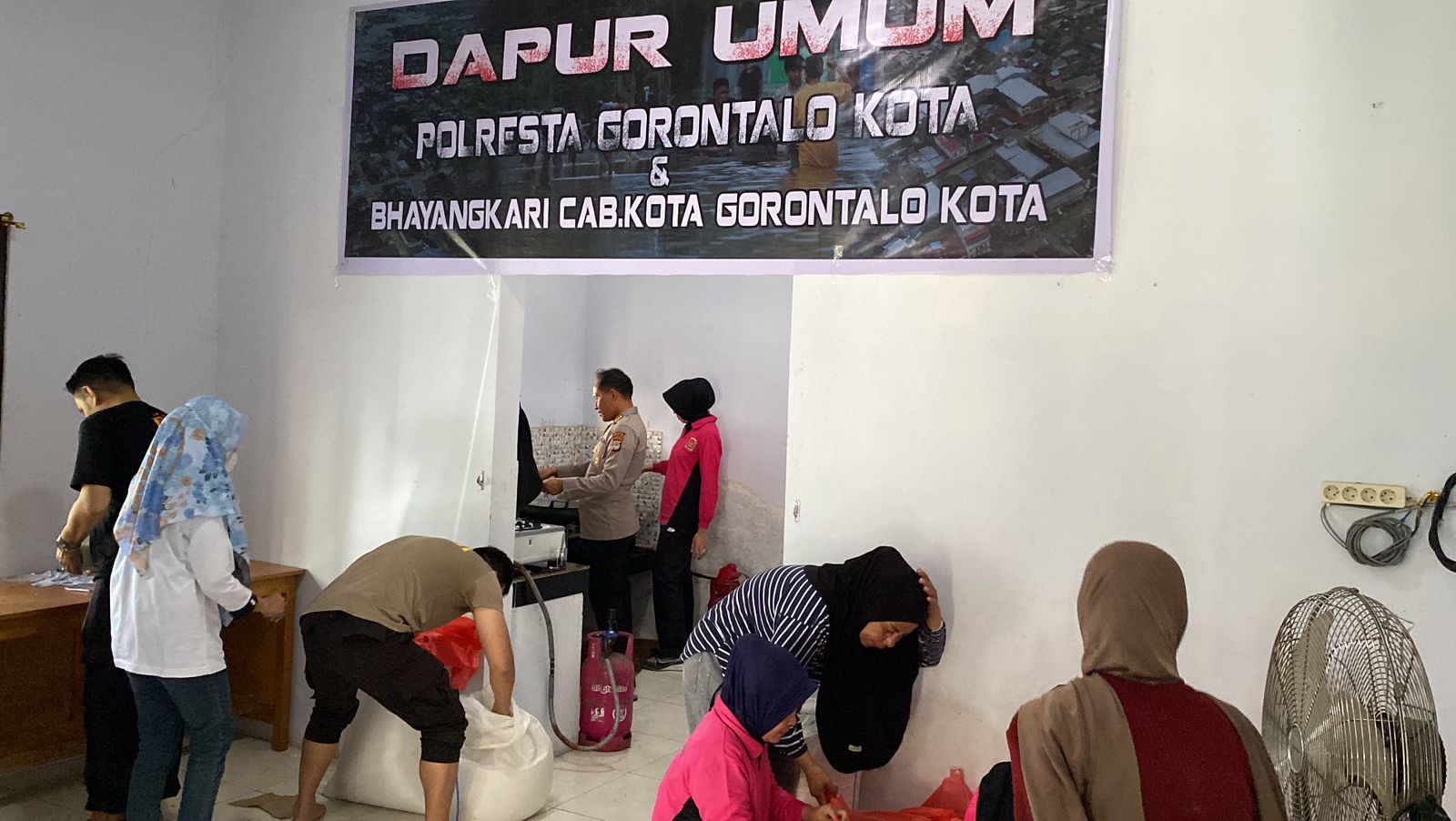 Sebagai wujud rasa peduli kepada Warga yang terdampak banjir,Polresta Gorontalo Kota membantu meringankan beban masyarakat dengan menyiapkan dapur umum yang digelar di rumah dinas asrama polisi, Sabtu (13/07)