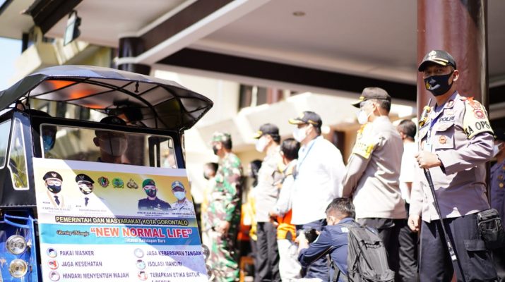 Polres Gotontalo Kota – Kebijakan new normal, personil Pores gorontalo Kota,Tni dan pemerintah kota gelar sosialisasi dengan menggunakan bentor. Tujuannya untuk menerapkan kebijakan pemerintah terkait