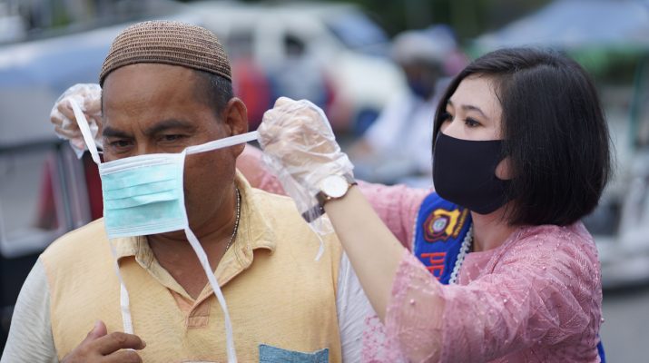 GUNAKAN KEBAYA,POLWAN BAGIKAN MASKER PADA PENGGUNA JALAN