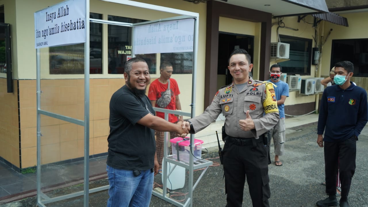 Kapolres Gorontalo Kota AKBP Desmont Harjendro , A.P, S.I.K, M.T melalui kabag ops Kompol Lufti Amir, SH S.I.K mengucapkan terima kasih atas keperdulian Haji Ramli pemilik warkop amal terhadap Polri dengan memberikan bilik sterilisasi kepada Polres Gorontalo Kota