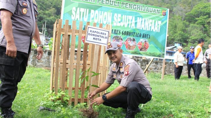 Polres Gorontalo Kota – Jumat (10/01/20)  pukul 08.00 wit Kapolres Gorontalo Kota bersama DANDIN 1304 , Kepala dinas lingkungan hidup Kota Gorontalo , Kasie Rehabilitasi Lingkungan Hidup dan kehutanan Prov Gorontalo , Pju Polres Gorontalo Kota , Kapolsek Jajaran , Bhayangkari , Perwakilan mahasiswa  perduli lingkungan dan Pks ( penjaga keamanan sekolah ) binaan sat binmas  menggelar aksi penanaman pohon dalam rangka “Polri Peduli Penghijauan”.