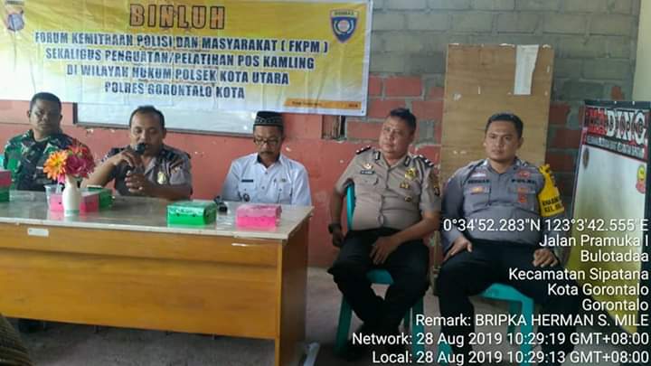 Polres Gorontalo Kota – kanit Binpolmas Sat Binmas Polres Gorontalo Kota Aipda Abdul Rohman bersama anggota melaksanakan giat Binluh tentang pemberdayaan Forum Kemitraan Polisi dan Masyarakat (FKPM), serta Penguatan Pos Kamling di kelurahan Bulotadaa Barat, kecamatan Sipatana, kota Gorontalo.