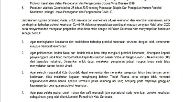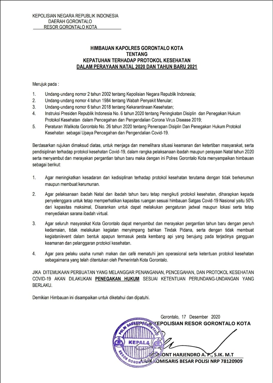 Polres Gorontalo Kota,Kepolisian Polres Gorontalo Kota mengeluarkan himbauan melalui surat edaran tentang kepatuhan terhadap protocol Kesehatan dalam perayaan Natal 2020 dan Tahun Baru 2021, tertanggal 17 Desember 2020 dengan merujuk pada beberapa pasal undang-undang,Jumat (18/12/20)