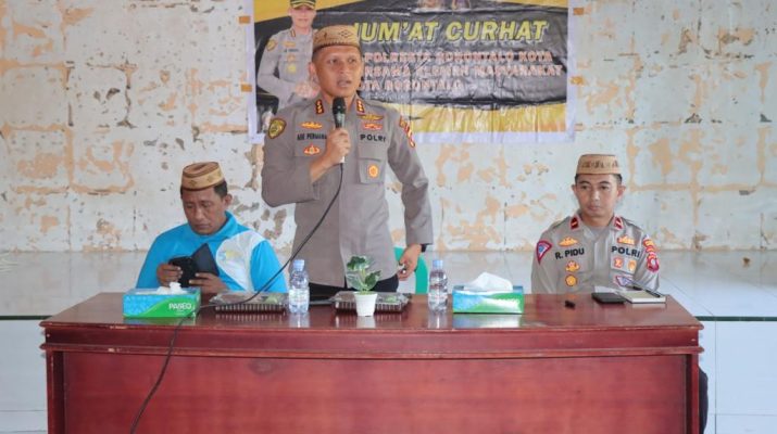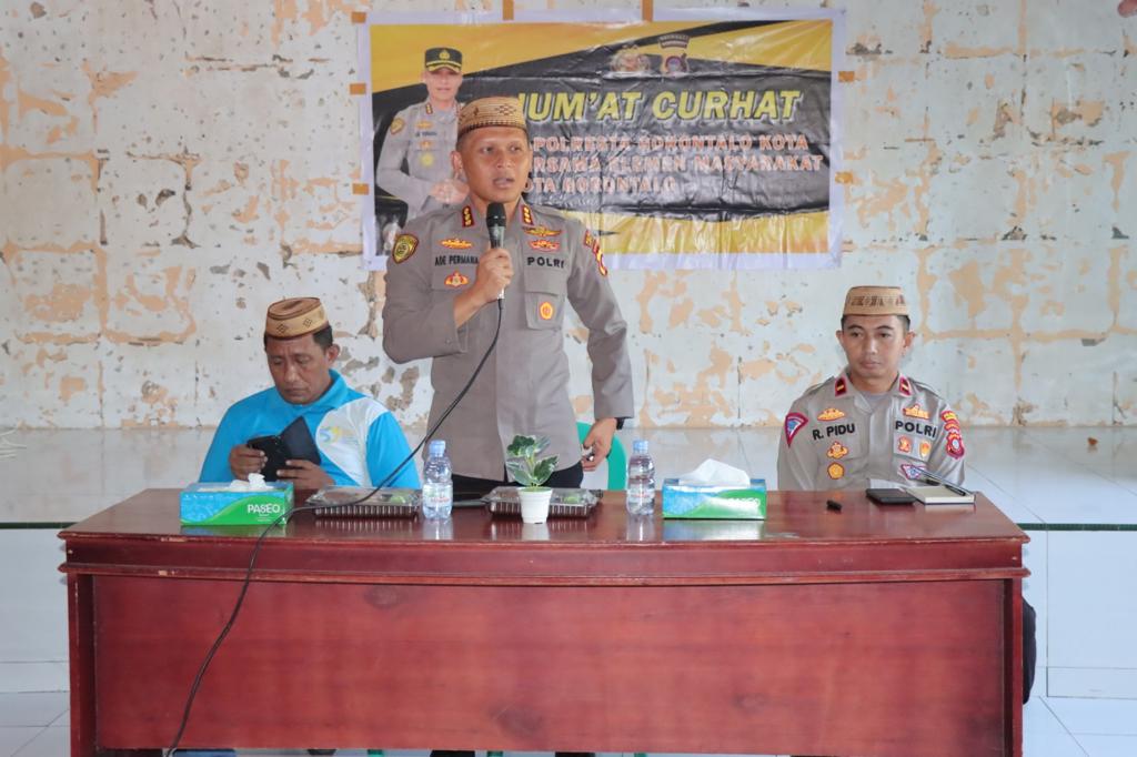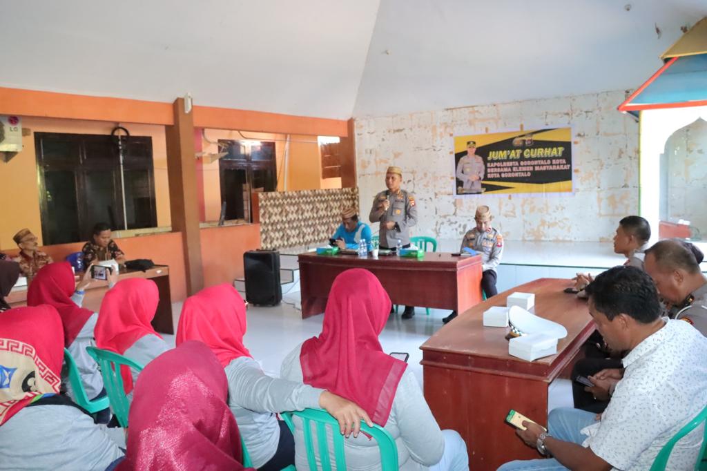 PolrestaGorontaloKota,Kombespol Dr. Ade Permana, S.I.K.,M.H selaku Kapolresta Gorontalo Kota didampingi Para PJU kembali menggelar Kegiatan Rutin Jumat Curhat yang kali ini dihadiri oleh Camat Dungingi Bapak Heriyanto Abas, Kapolsek Dungingi, Lurah Huangobotu, Lurah Tuladenggi, Lurah Tomulabutao dan masyarakat yang berada di Kecamatan Dungingi, Kota Gorontalo, pada Jumat (09/06/2023)