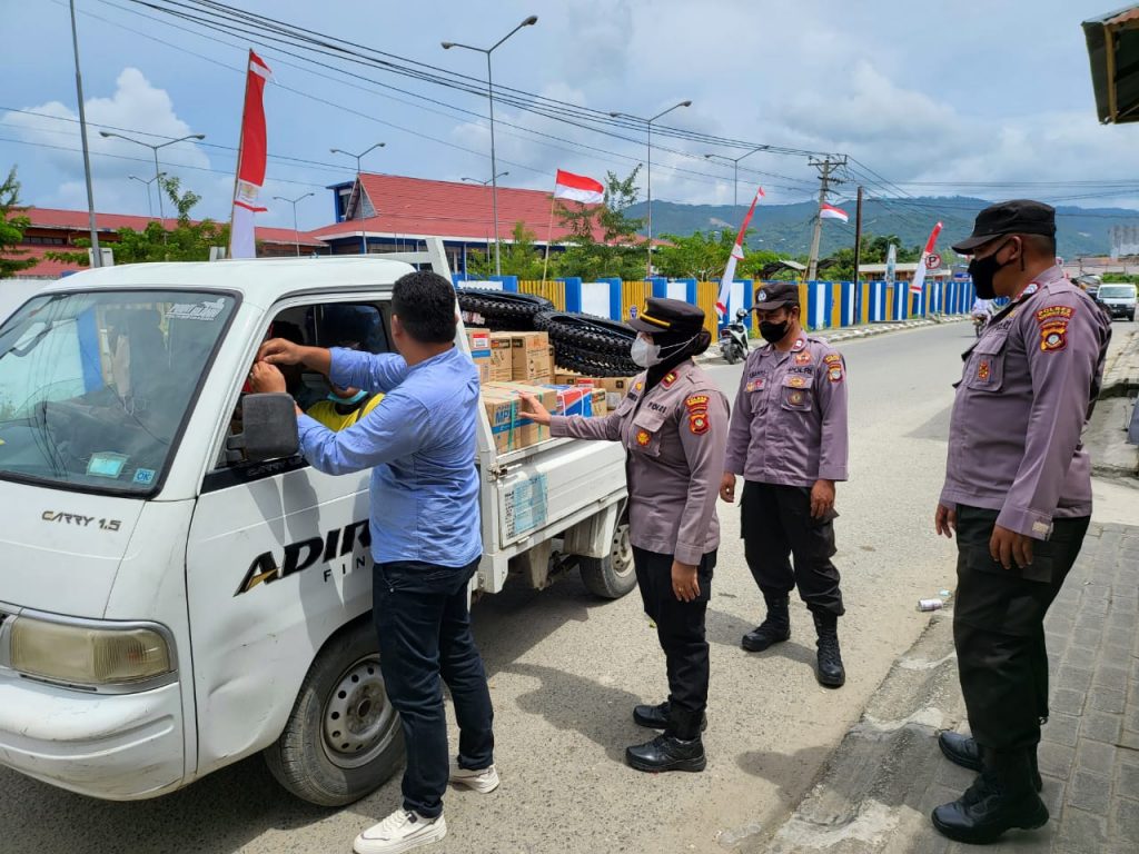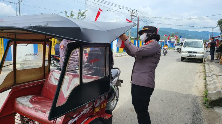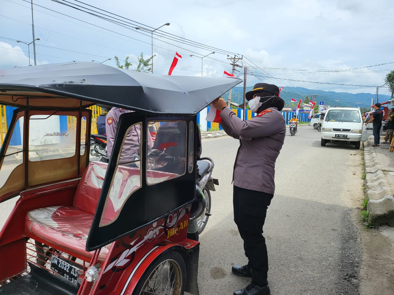 Tampak terlihat, personel Polsek memberhentikan setiap Kenderaan baik roda dua, roda tiga (bentor) dan roda empat untuk membagikan bendera.