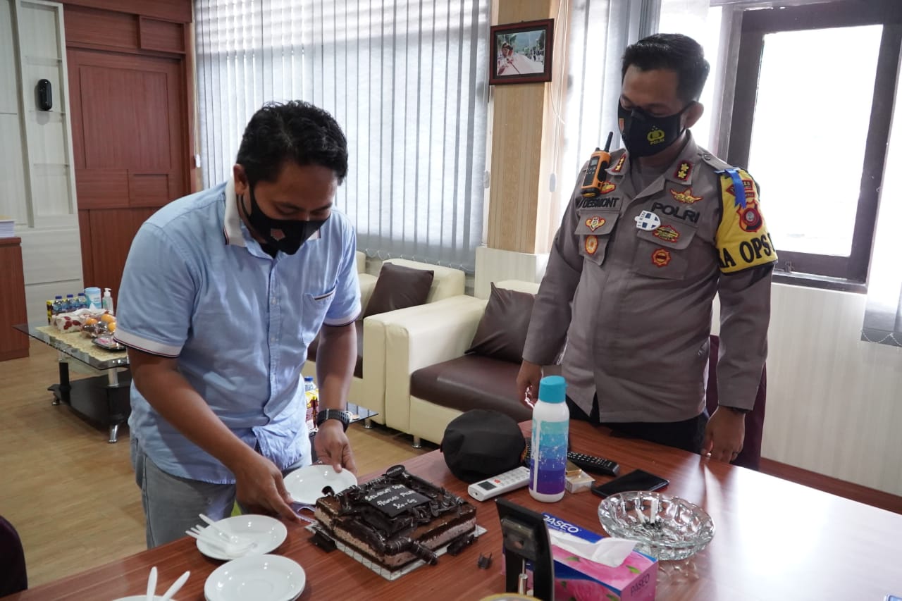Kedatangan para mitra polri ini masih dalam rangkaian Hari Ulang Tahun Humas Polri ke 69 dengan memberikan kue langsung kepada Kapolres Gorontalo Kota Akbp Desmont Harjendro sebagai wujud keakraban antara polri dan Mitra Polri.