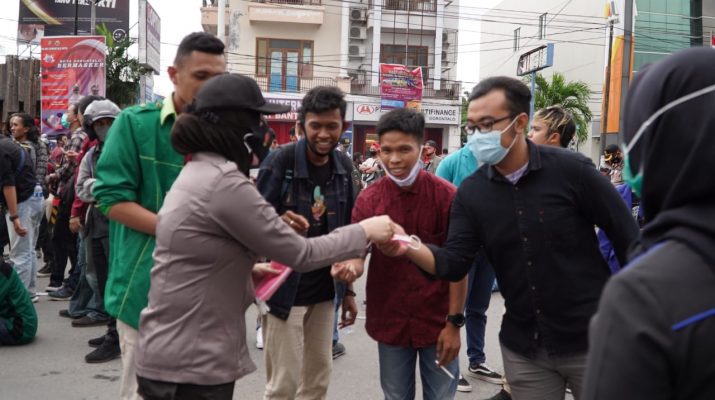 “Kami bagikan air minum kepada mahasiswa yang tengah melakukan aksi demo juga berikan masker ke mereka yang tidak menggunakan masker, hal ini agar terhindar dari penyebaran covid 19”, Ujar Akbp. Desmont.