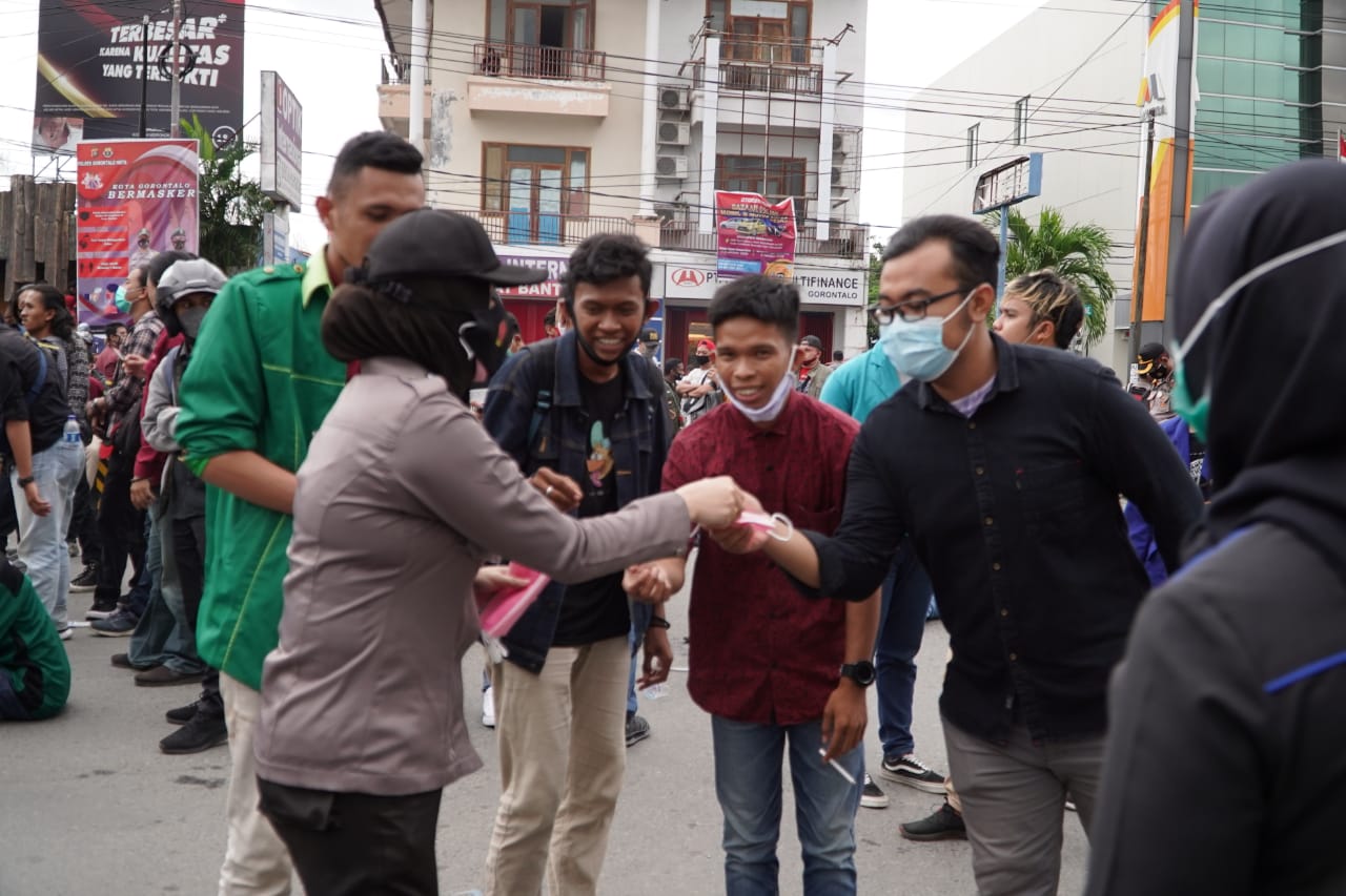 Kapolres Gorontalo Kota Akbp. Desmont Harjendro,A.P, S.I.K,M.T mengatakan, Aksi bagi-bagi air minum dan masker kepada para mahasiswa ini sebagai bentuk kepedulian Polri terhadap mahasiswa, guna mencegah timbulnya klaster baru dalam demo UU Cipta Kerja di Kota Gorontalo.