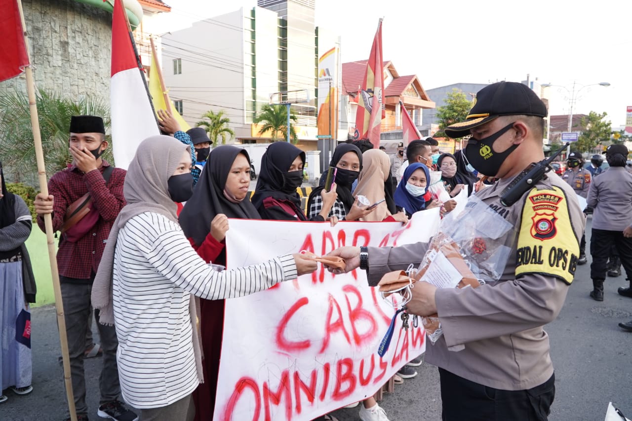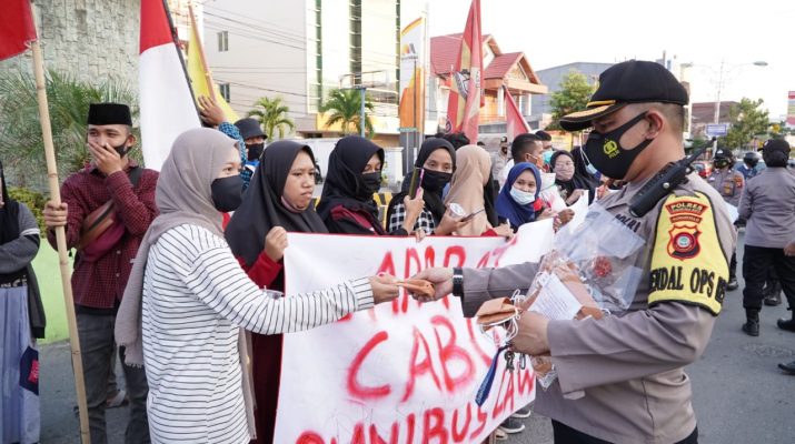 PERSONIL POLRES GORONTALO KOTA BAGIKAN MASKER PADA SAAT PENGAMANAN UNJUK RASA