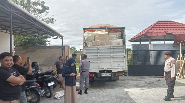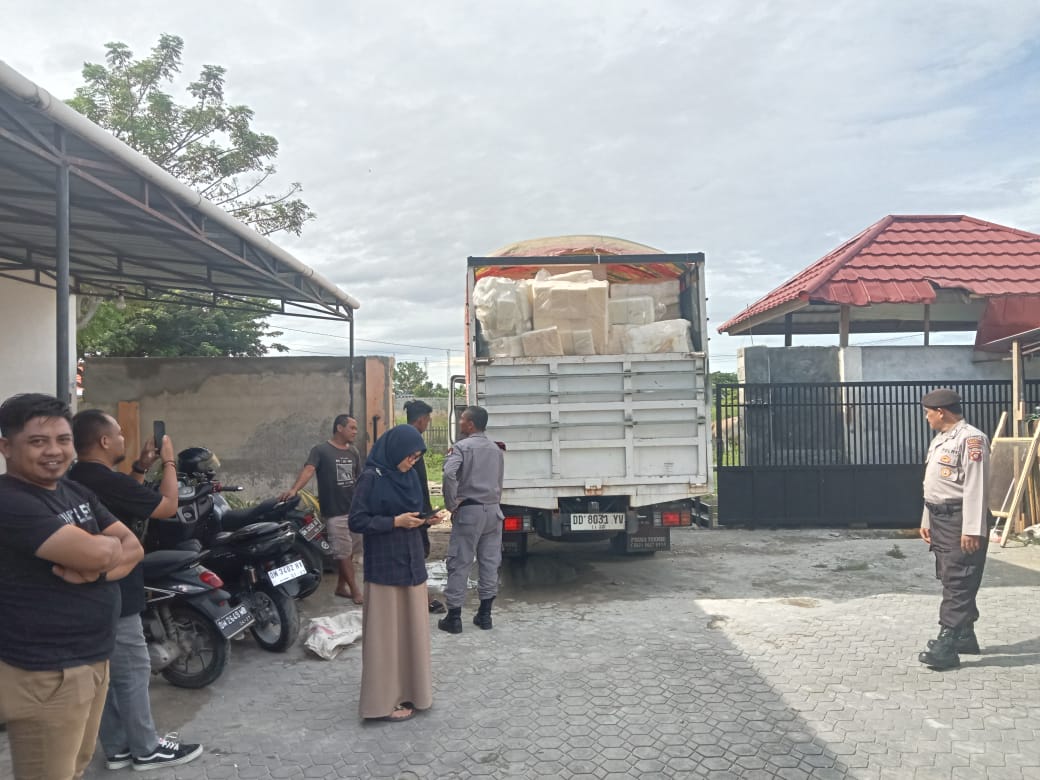 PolrestaGorontaloKota,Personil Polresta Gorontalo Kota yang tersprin pada OMB melaksanakan pengamanan kedatangan logistik di kantor KPU Kota Gorontalo
