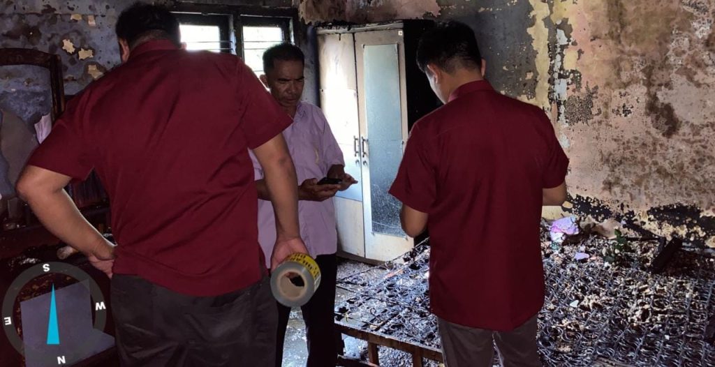 Dari keterangan saksi Lk. OLY, sekitar pukul 11.30 wita dirinya melihat kebulan asap dari dalam rumah kemudian saksi dan beberapa tetangga dibantu komunitas Maxim mendobrak rumah untuk memeriksa keadaan kemudian membantu memadamkan api yang ada didalam kamar menggunakan air galon yang ada di depot depan rumah korban, lalu menghubungi pihak pemadam Kebakaran.