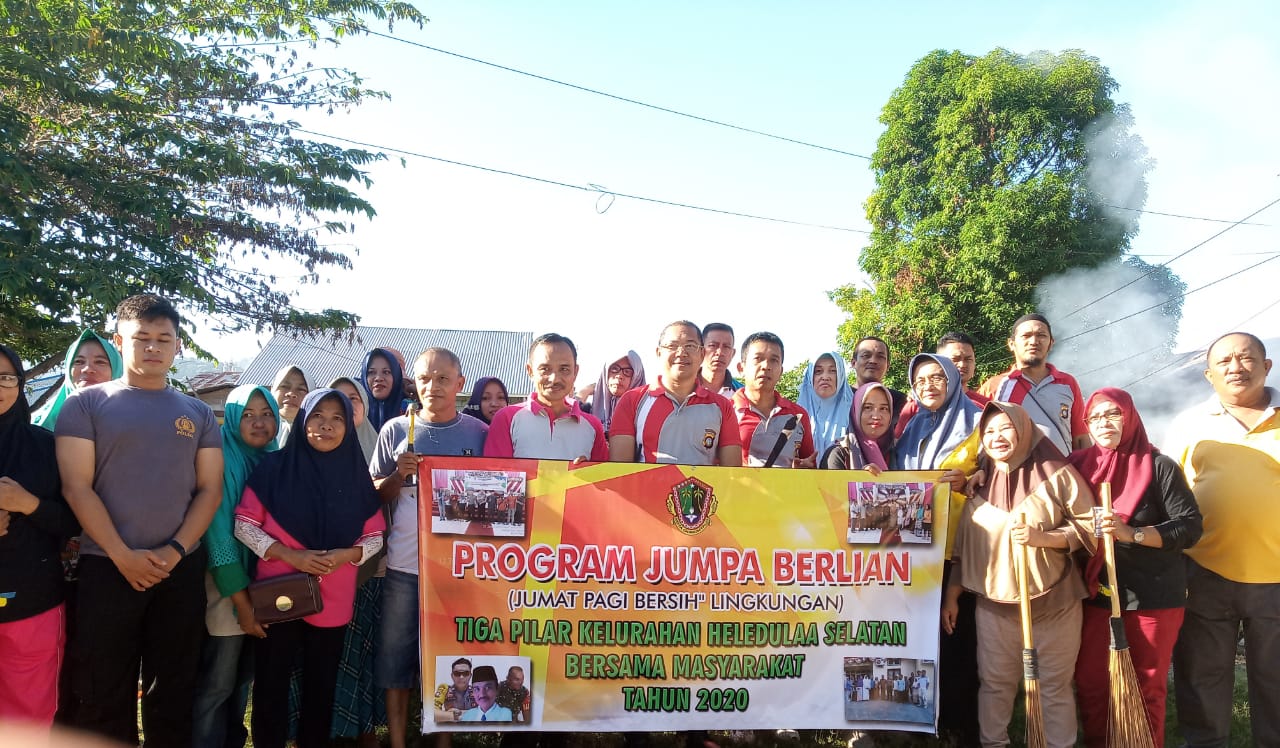 Polres Gorontalo Kota – Bhabinkamtibmas Kel.Heledulaa selatan Polsek kota timur Briptu Rizki Djau bersama tiga pilar menggagas program Jumpa Berlian ( jumat pagi bersih bersih lingkungan ),Jumat (24/01/2020)