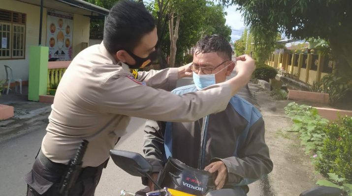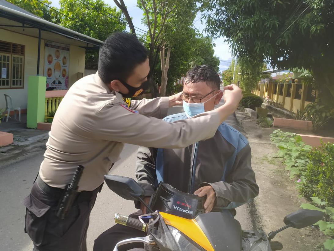 Saat melakukan patroli, Bripka Steven mendapati warga yang tidak memakai masker, Ia pun memberikan masker gratis dan memakaikan masker tersebut.