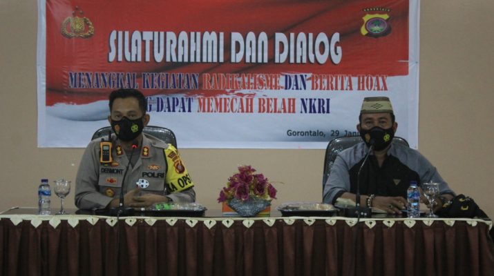 Jumat pagi Kapolres Gorontalo Kota AKBP. Desmont Harjendro AP, SIK, MT didampingi Kasat Intel AKP. Husin Hasan melaksanakan kegiatan silahturahmi dan dialog bersama para tokoh agama dengan tema Menangkal Radikalisme Dan Berita Hoax Yang Dapat Memecah Belah NKRI,(29/01/2021)
